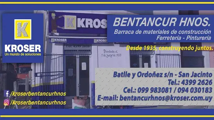 La ferretería Kroser Barraca Bentancur está localizada en el departamento de Canelones en la ciudad San Jacinto. Se dedica a la venta de insumos para el hogar y herramientas de ferretería, contando con un surtido completo de productos pensados para todo tipo de clientes.